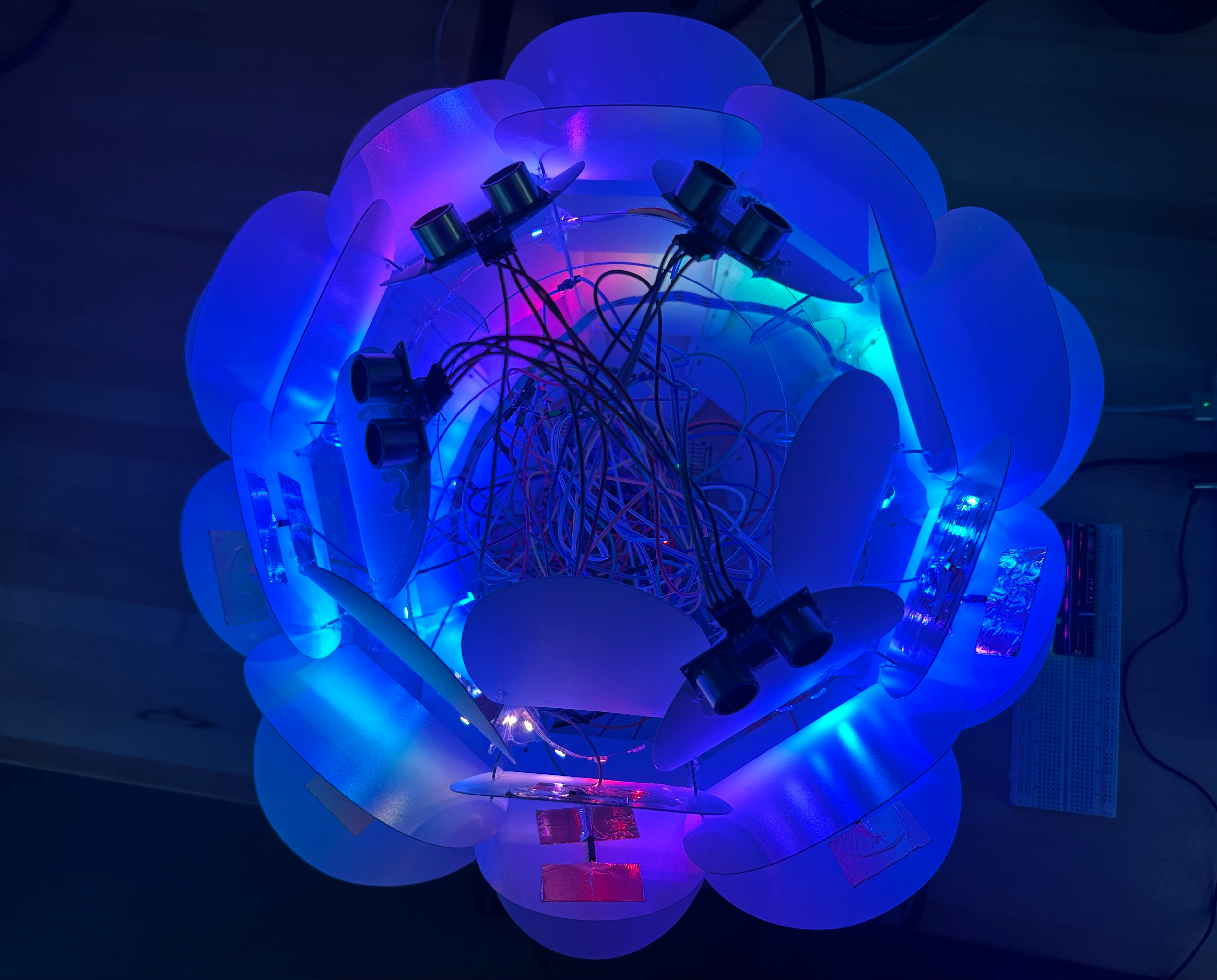 An interactive musical instrument with touch petals, IMU-based tremolo, and reactive lighting synchronized via ESP32 and Max/MSP